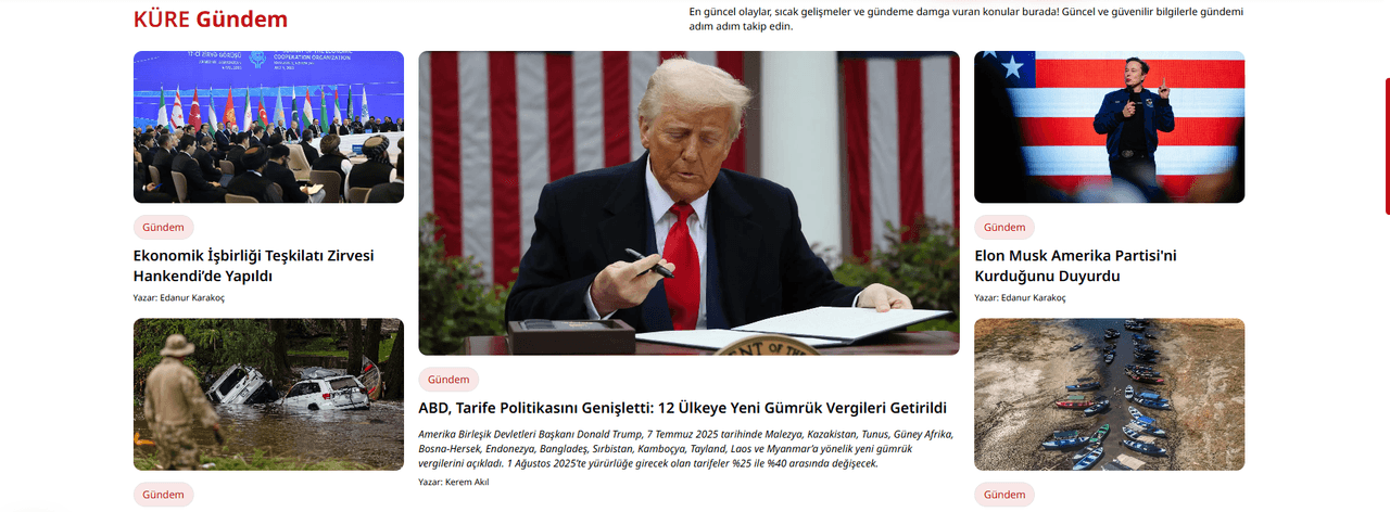 All content published in this section undergoes editorial review, relies on verifiable sources, and employs a non-opinionated narrative. A wide range of topics including current crises, scientific advances, political transformations, natural disasters, cultural events, and technology news are covered under KÜRE Agenda. Additionally, agenda entries are designed to be updated as needed; thus, information is revised within the system as events evolve. The agenda section enables readers to follow current developments while providing intellectual depth by situating events within broader contexts.
