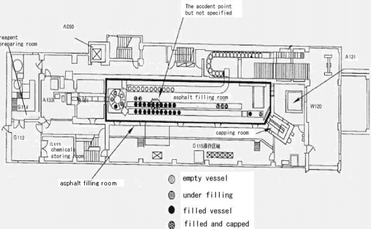 In March 1997, at the state-operated (Dōnen/PNC) site in Tokaimura, a fire broke out during the bituminization process—where liquid radioactive waste is mixed with asphalt in a heated state to form a solid matrix—followed by an explosion. The process inherently involves heat-releasing chemical reactions, making thermal balance, mixing ratios, ventilation/filtration, and continuous monitoring critically important. The incident caused visible damage to the facility roof, and emergency procedures were activated on-site.