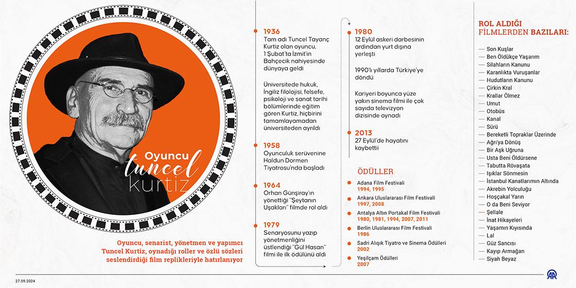 Tuncel Tayanç Kurtiz, born on 1 February 1936 in Bahçecik, Kocaeli, was a Turkish actor, director, screenwriter, and producer in theatre, cinema, and television. Throughout his career, Kurtiz worked both in Türkiye and abroad. After receiving education in diverse fields such as literature and philosophy, he turned to acting and embarked on an artistic journey spanning theatre, cinema, and television. He passed away on 27 September 2013 at his home in Etiler, Istanbul, and was buried in Çamlıbel village, district of Edremit, Balıkesir.