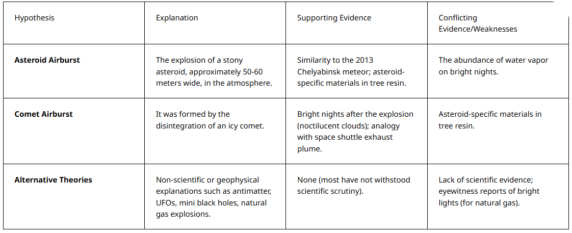 Cometary Airburst Hypothesis: This theory proposes that the event was caused by the disintegration of an icy comet. The bright nights observed after the explosion are explained by high levels of water vapor released into the atmosphere from the comet's icy nucleus.