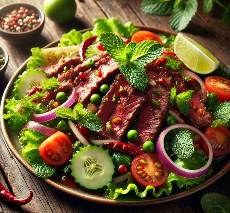 Yam Nua is a classic Thai salad that blends tropical freshness with the depth of grilled beef, exemplifying a culinary approach suited to hot climates: light yet nutritionally dense. In Thailand, salads (yam) are not merely cold appetizers; they are regarded as full meals with equal status to main dishes due to their acidic, spicy, and aromatic profiles. Yam Nua is especially popular in summer months, valued for meeting protein needs while offering a cooling effect on the body.