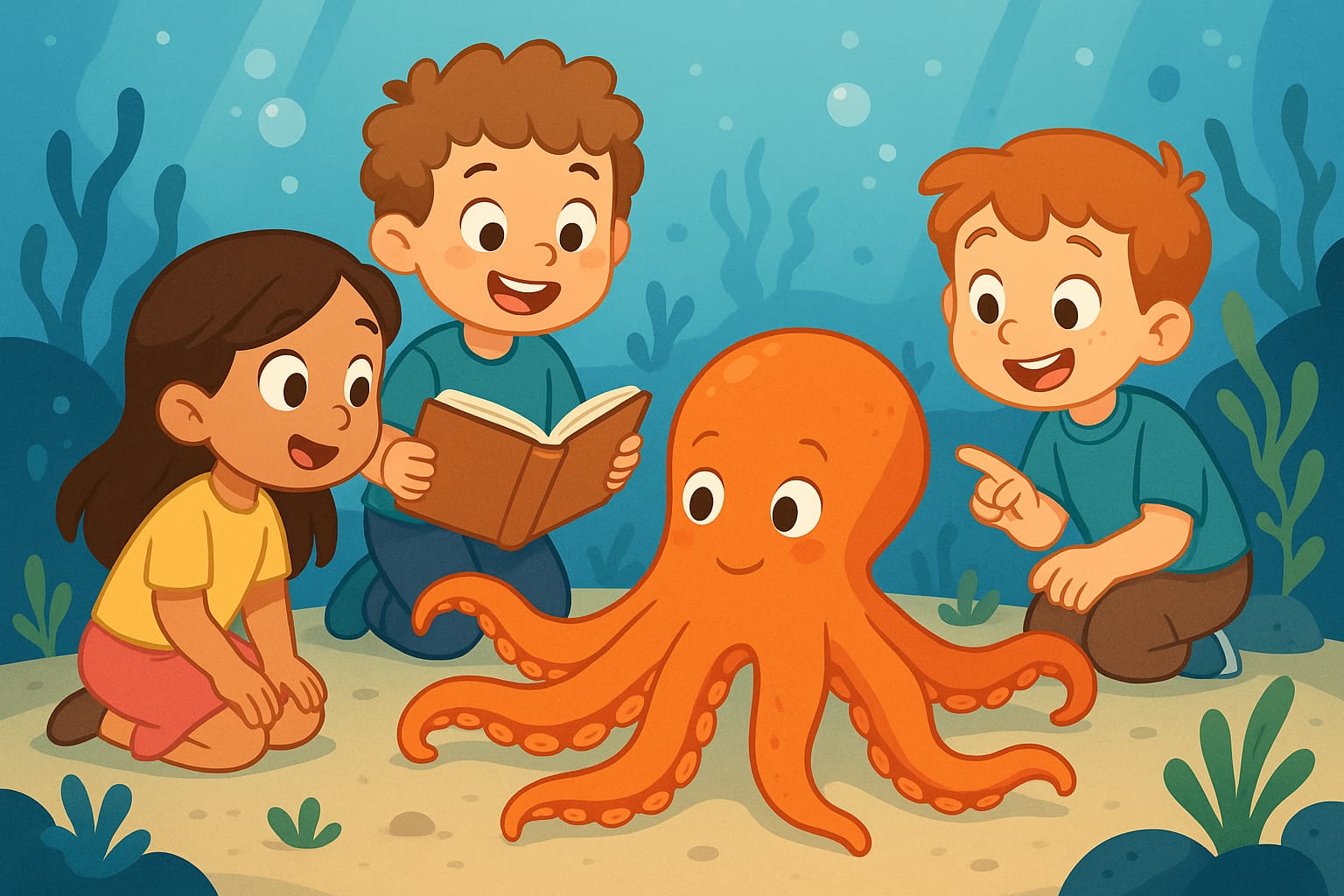 Ahtapot İnceleyen Çocuklar (Yapay Zeka ile Oluşturulmuştur.)