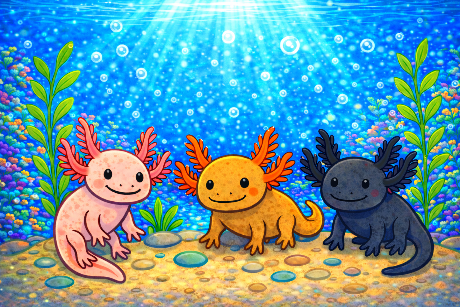 Farklı renkteki aksolotllar. (Yapay Zeka ile oluşturulmuştur.)