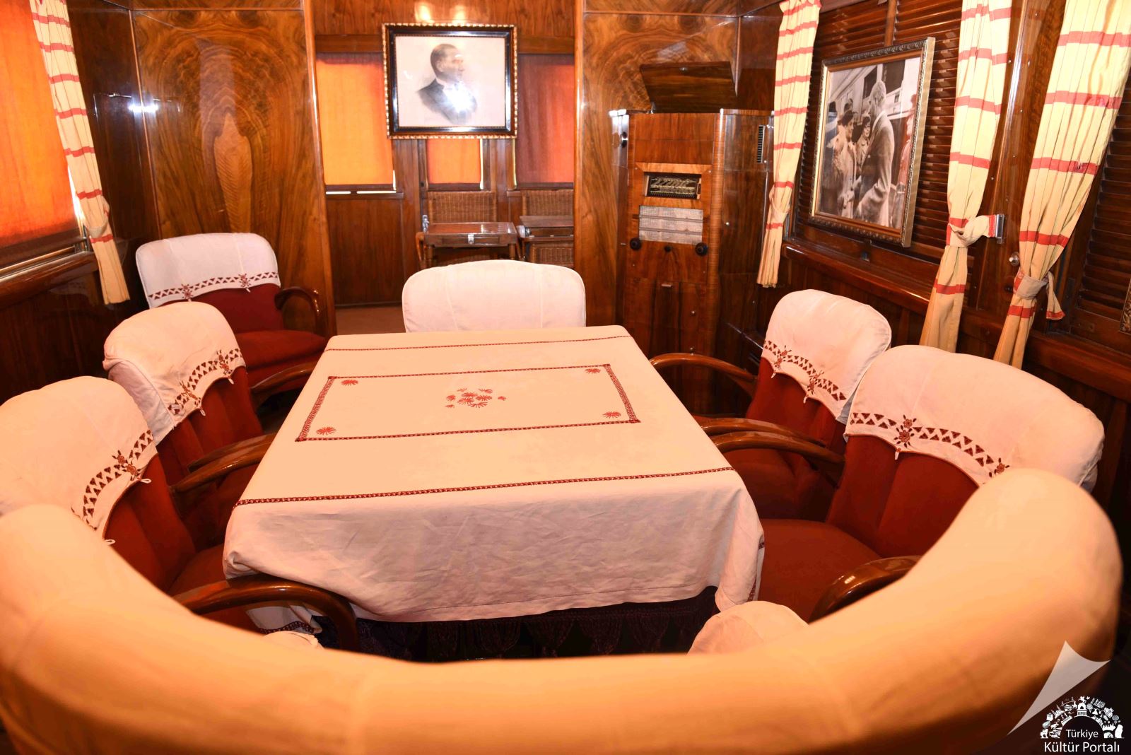 Salonda abanoz ağacından yapılmış bir masa ve koltuklar sergilenir. Burada, Atatürk'ün seyahatleri sırasında dinlediği plakların çalındığı bir gramofon (plak çalar) ve bir radyo bulunur. Ayrıca, tavla ve satranç takımı gibi kişisel eşyaları da görebilirsin.
