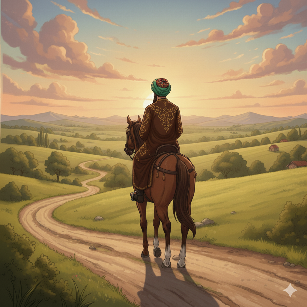 Bursa'ya doğru yola çıkan Aziz Mahmud Hüdâyî, temsili (Görsel yapay zekâ ile oluşturulmuştur).
