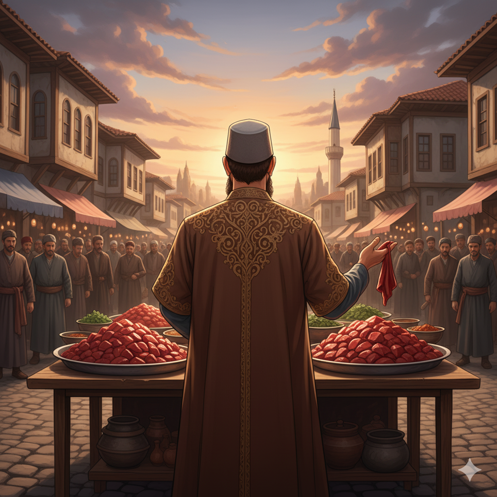 Aziz Mahmud Hüdâyî Bursa sokaklarında ciğer satarken, temsili (Görsel yapay zekâ ile oluşturulmuştur).