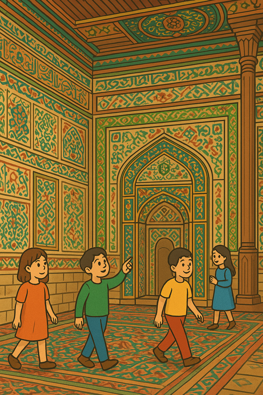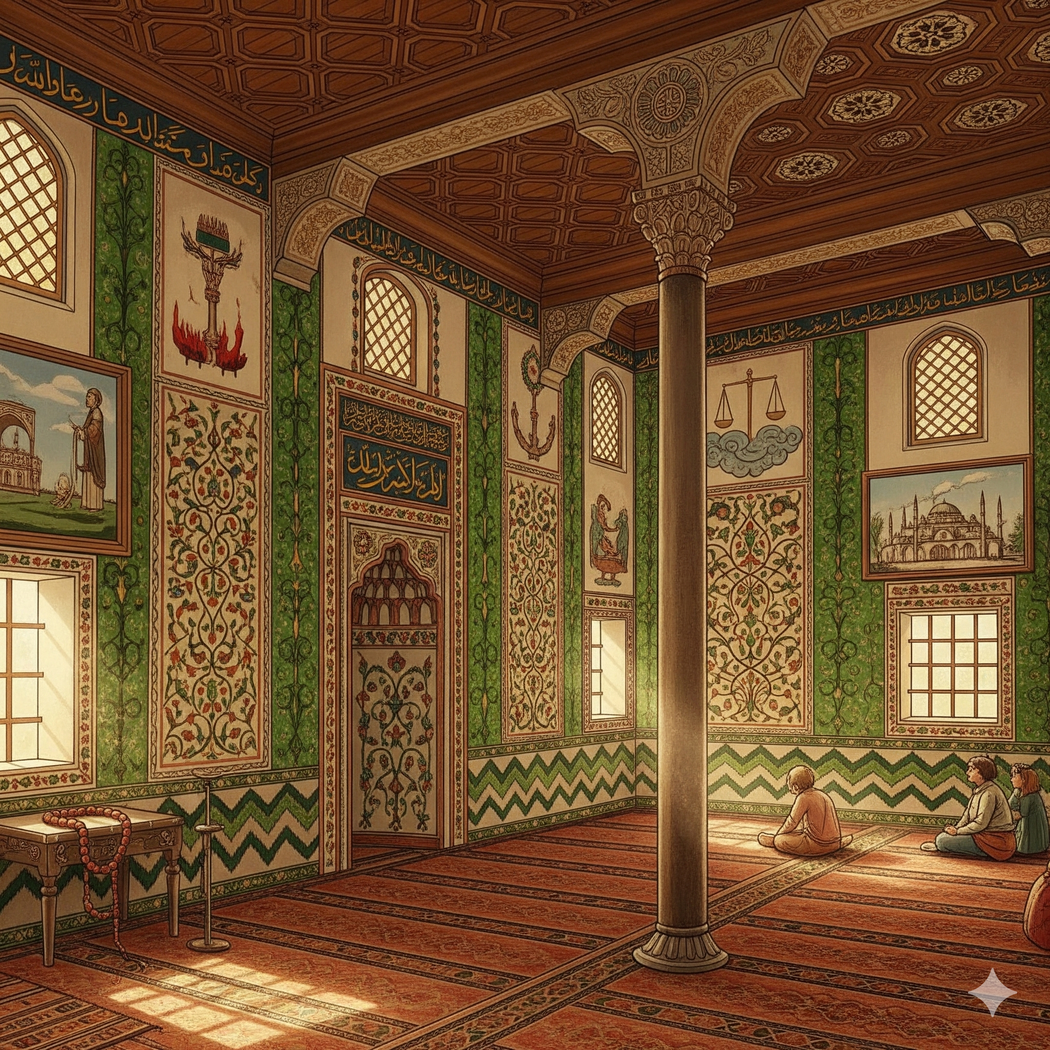 Caminin içi tam anlamıyla bir renk şölenidir. Kalem işi süslemeler kök boyasıyla yapılmıştır. Yeşil, kahverengi, mavi ve siyah renkler özenle kullanılmıştır. Duvarlar zikzak desenlerle kuşatılmış, dikey panolarla bölünmüş ve içleri çiçekler, geometrik motifler ve dini sembollerle süslenmiştir. Dört halifenin isimleri, cennet ve cehennem tasvirleri, bir terazi figürü ve hatta Edirne Selimiye Camii’nin resmi duvarlarda yer alır. Ahşap tavan göbekleri, kirişler ve direk başlıklarında ince marangozluk örnekleri göze çarpar.