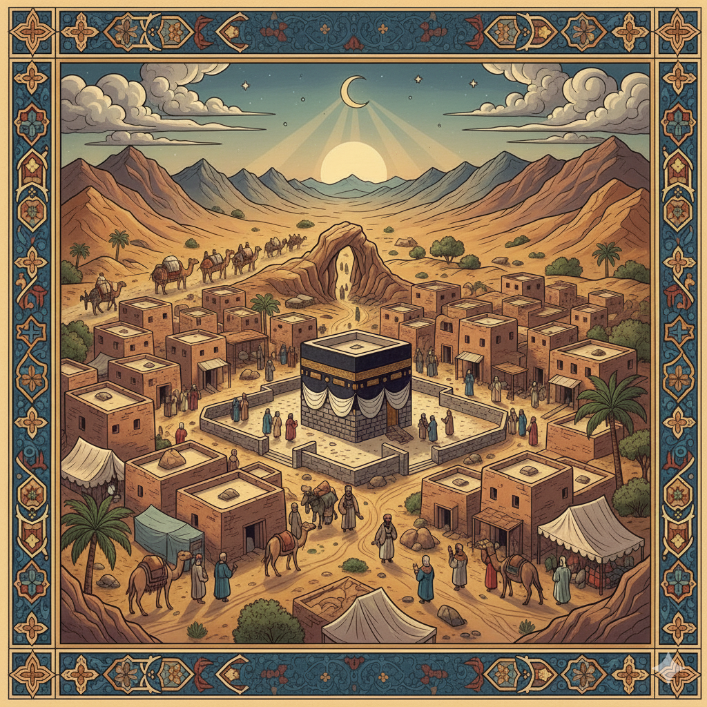 İslamiyet'in ilk dönemlerinde Mekke şehri (Görsel yapay zekâ ile oluşturulmuştur).