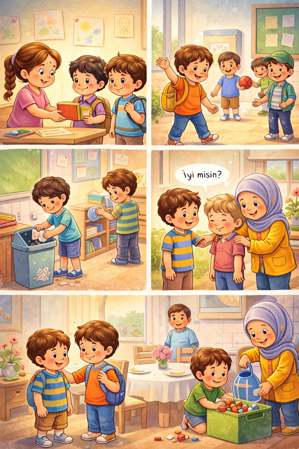 - İyilik Gözlem Panosu: “Bugün sınıfta hangi iyilikleri gördük?” panosu; “gösteriş”e kaçmaması için davranışlar genel yazılır (isim yok).