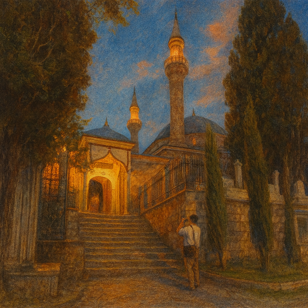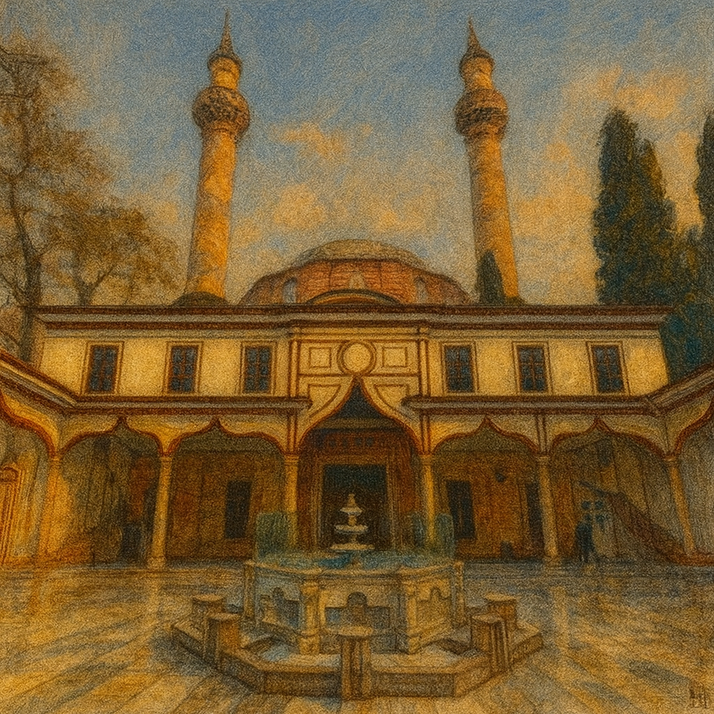 - Avlu: Türbe, cami avlusunun içinde yer alır; avluda ziyaret kültürüne uygun şadırvan ve revaklı dolaşım alanları bulunur.