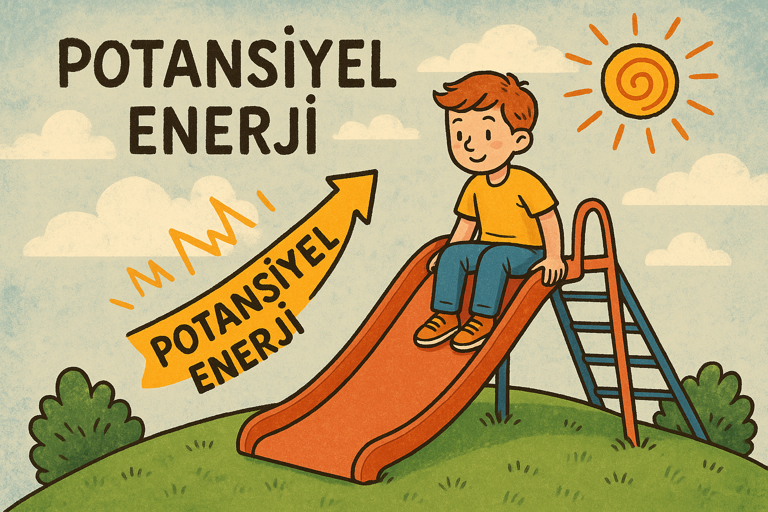 Kaydırağın Tepesinde Bir Anlığına Durduğunda, Potansiyel Enerji Biriktirirsin. (Yapay Zeka ile Oluşturulmuştur.)
