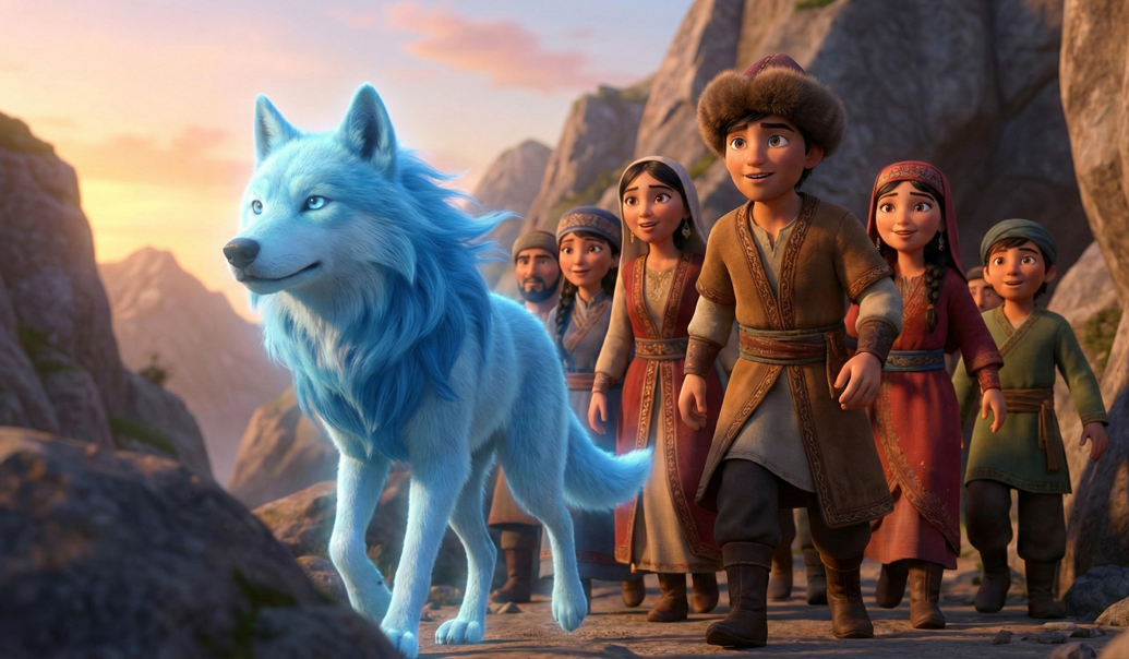 Efsaneye göre, dağdan açılan geçidin önünde, tüyleri gök mavisi parıltılar saçan, asil duruşlu bir kurt belirdi. Bu kurt, vahşi bir hayvan gibi saldırmıyor, aksine insanlara güven veren bir tavırla duruyordu. Kurdun gözleri zeka ile parlıyordu.