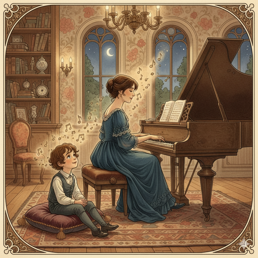 Annesi piyano çalarken onu dinleyen küçük Chopin (Görsel yapay zekâ ile oluşturulmuştur).