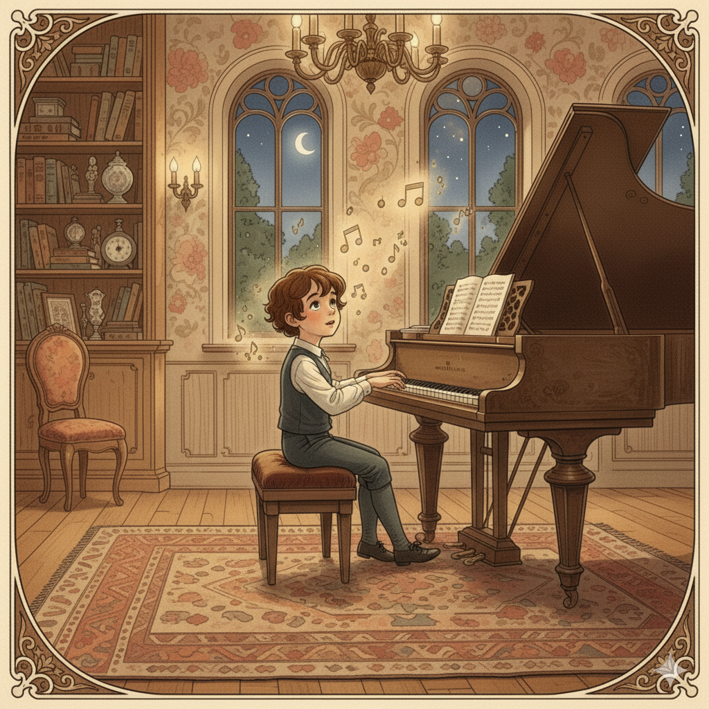 Piyano çalan küçük Chopin (Görsel yapay zekâ ile oluşturulmuştur).