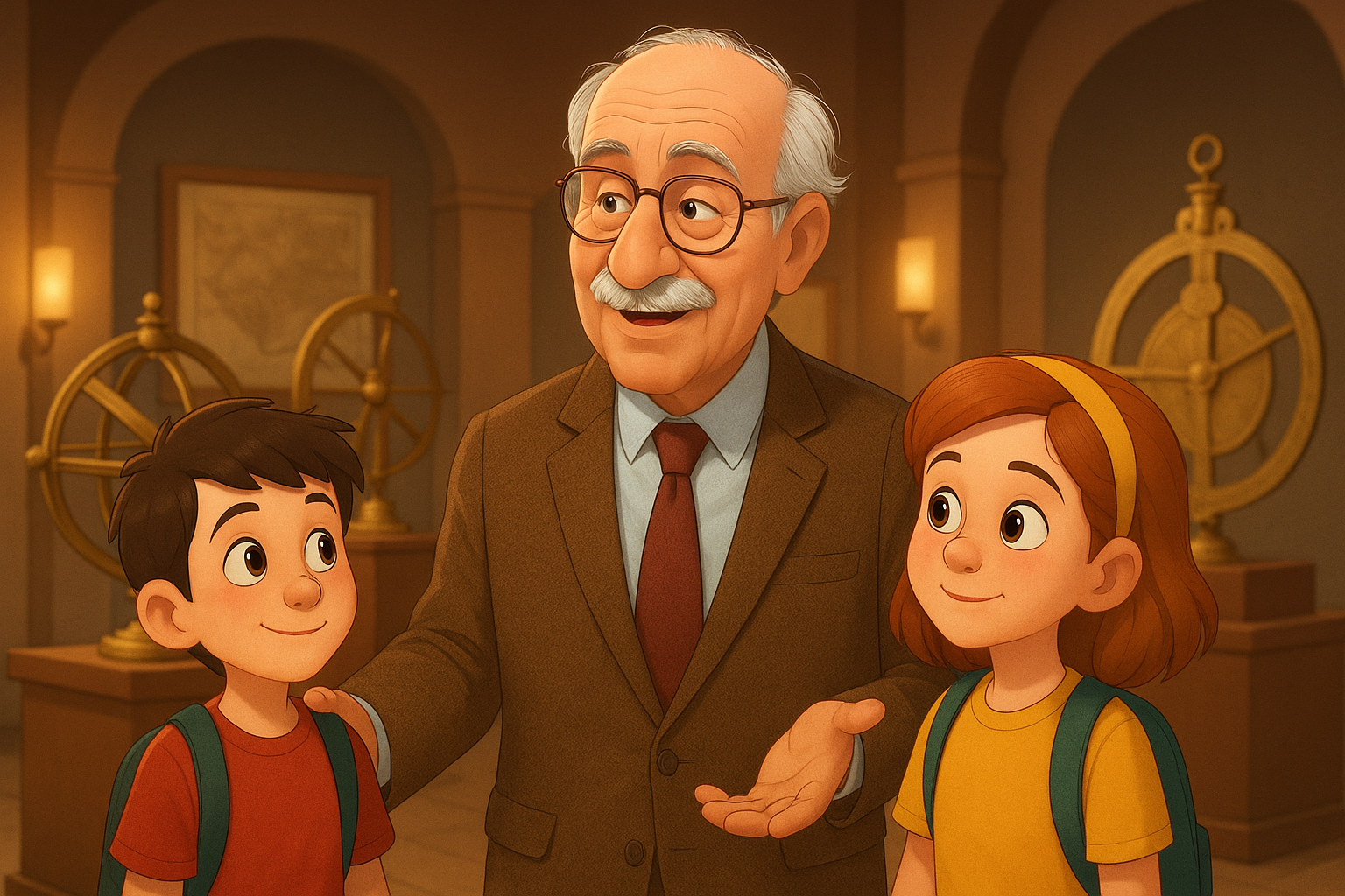 Müzede Fuat Sezgin ve Çocuklar (Yapay Zeka ile Oluşturulmuştur.)