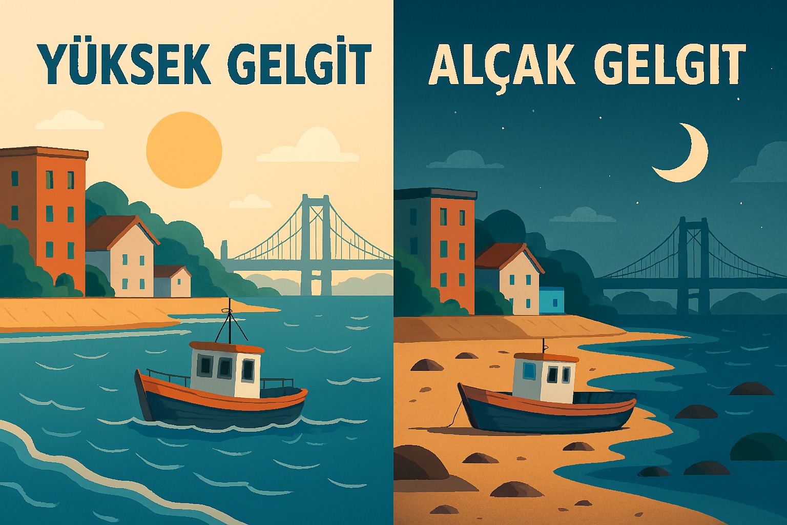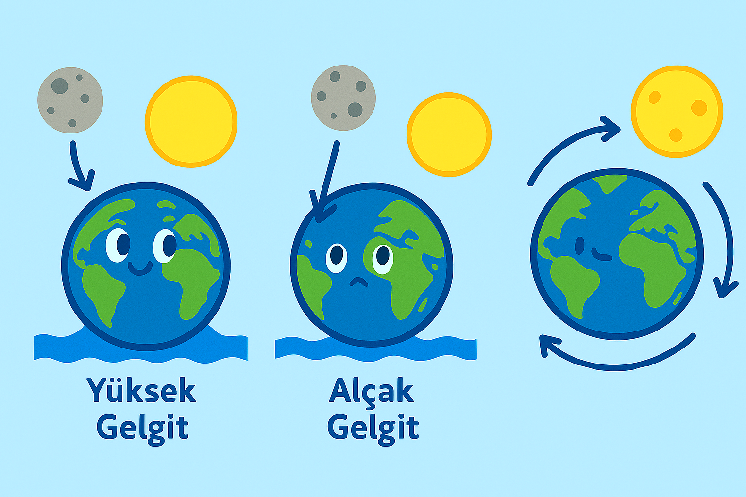 Ay, Dünya’ya Güneş’ten çok daha yakın olduğu için denizlerdeki suyu daha güçlü çeker. Ay’a bakan tarafta deniz seviyesi yükselir çünkü su Ay’ın çekimine doğru hareket eder. Dünya’nın tam karşı tarafında ise gezegenin dönme hareketi nedeniyle yine su kabarır. Böylece aynı anda iki bölgede yüksek su seviyesi oluşur. Bu iki bölge arasında kalan alanlarda ise su çekilerek alçak seviyeye iner.