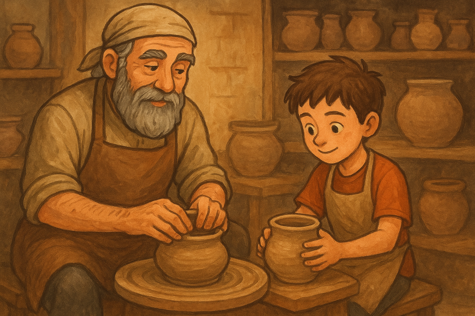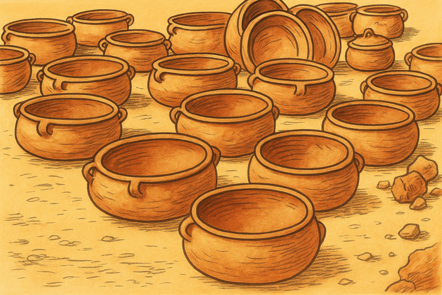 Çömlekçi çarkı kullanılmaz; kadınlar çamuru döner tabla üzerinde elleriyle biçimlendirir ve kapları açık ateşte pişirir.