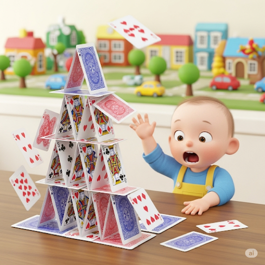 İskambil kâğıtlarından kule yapmak, dengede duran ve birbiri üzerine dizilen kâğıtların oluşturduğu bir yapıdır. Bu yapı, dışarıdan gelen en ufak bir etkiyle bile kolayca devrilebilir. Bu durum, günlük hayatta da bir projenin, planın veya durumun sağlam temellere dayanmadığını ve küçük bir sorunla bile bütünün bozulabileceğini anlatmak için kullanılır.