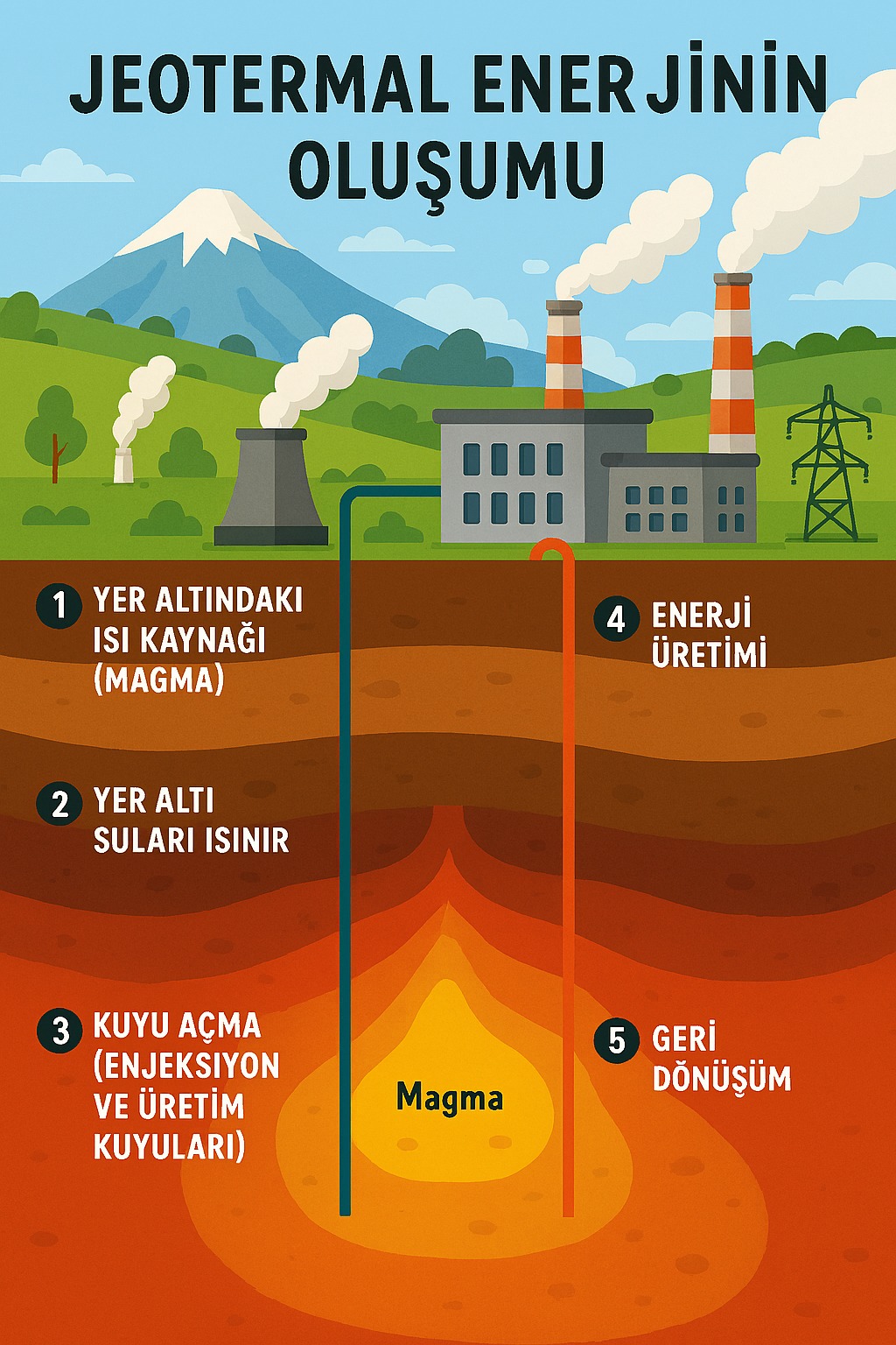 Jeotermal enerji, yerin derinliklerinden gelen doğal ısıdır. Yeraltındaki sıcak su ve buharlar, çatlaklardan yüzeye çıktığında enerji olarak kullanılabilir. Elektrik üretmek, evleri ısıtmak ve sanayide çeşitli işlemleri yürütmek için önemlidir.