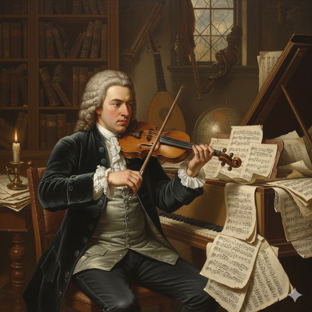 Profesyonel bir biçimde keman çalan genç Bach (Görsel yapay zekâ ile oluşturulmuştur).