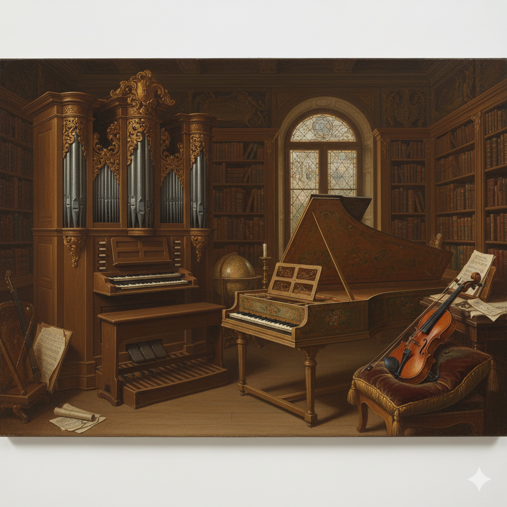 Sırasıyla soldan sağa org, klavsen ve keman (Görsel yapay zekâ ile oluşturulmuştur).
