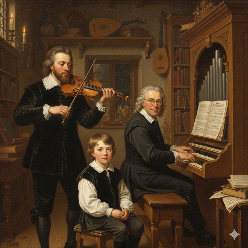 Babasını ve amcasını dinleyen küçük Bach (Görsel yapay zekâ ile oluşturulmuştur).