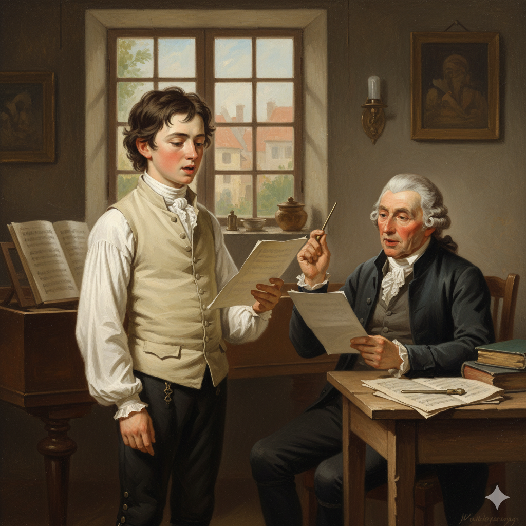 Haydn şan dersi alırken, temsili (Görsel yapay zekâ ile oluşturulmuştur).