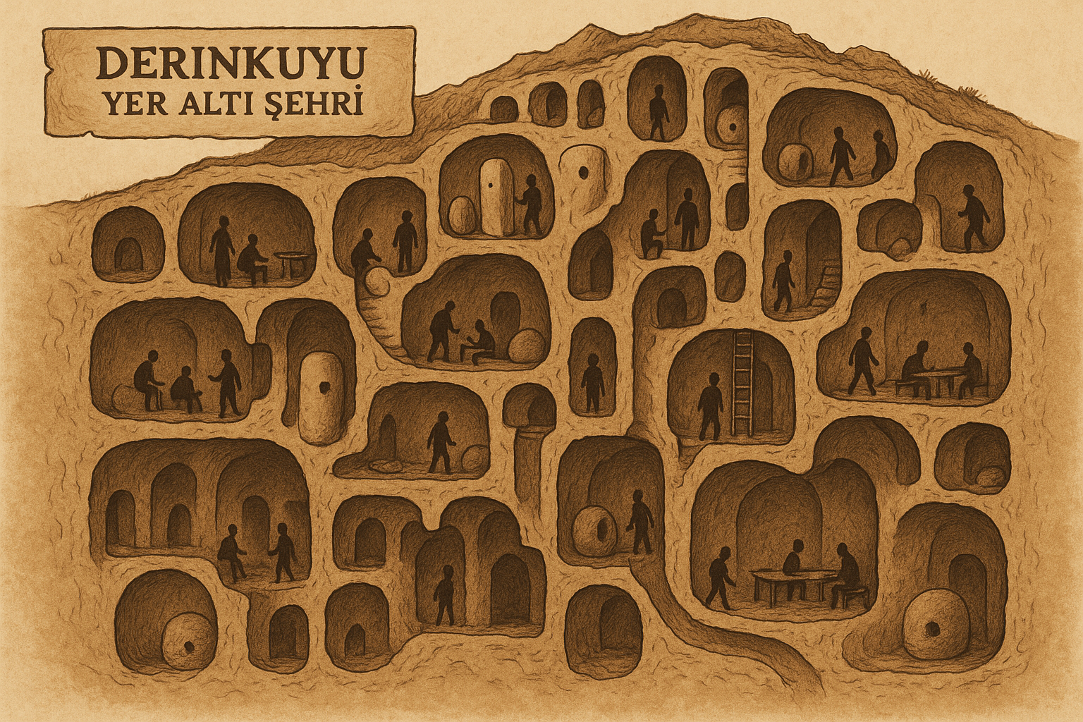 Kapadokya'da yaşayan insanlar, kendilerini korumak için çok akıllıca bir yol bulmuşlar. Yumuşak olan tüf kayalarını oyarak evler, kiliseler ve hatta koca koca şehirler yapmışlar! Yeraltı şehirleri dediğimiz bu yerler, tehlike anında insanların saklandığı güvenli yerlerdi. Bu şehirler o kadar büyük ki, içinde mutfaklar, havalandırma bacaları ve hatta şarap mahzenleri bile vardı.