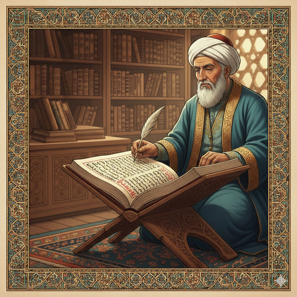Dîvânü Lugâti’t-Türk'ün yazılışı (Görsel yapay zekâ ile oluşturulmuştur).