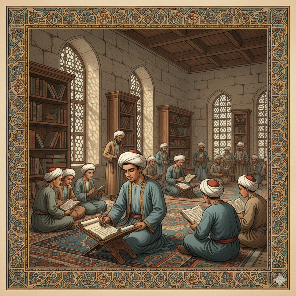 Kâşgarlı Mahmud medresede eğitim alırken (Görsel yapay zekâ ile oluşturulmuştur).