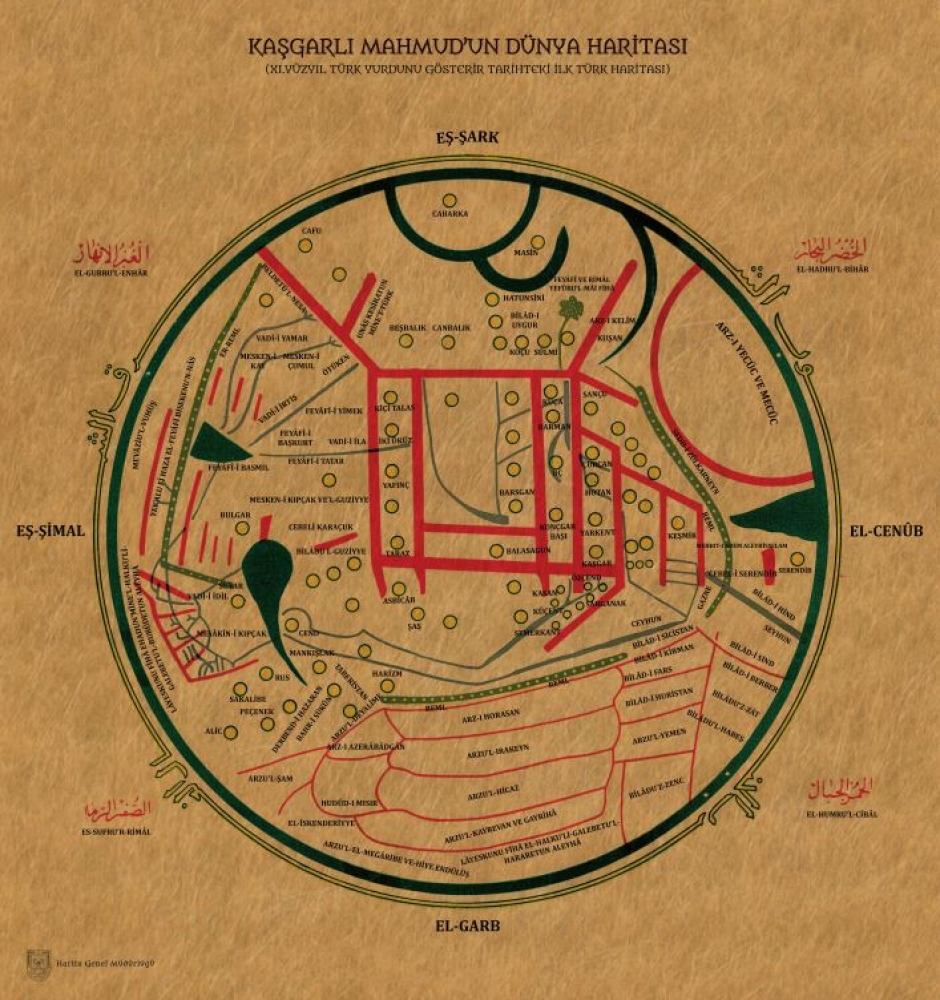 Kâşgarlı Mahmud’un 11. yüzyılda çizdiği dünya haritası (Latin harfleriyle güncellenmiş versiyon) (T.C. MSB Harita Genel Müdürlüğü)