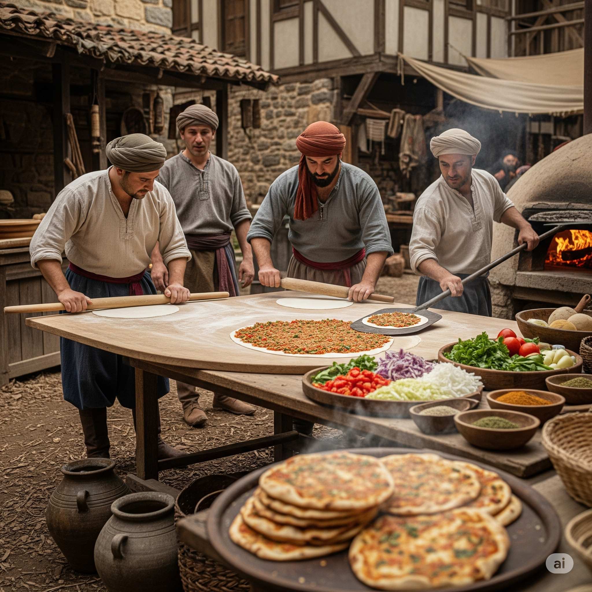 Geçmiş yüzyıllarda lahmacun pişiren ustalar. (Görsel yapay zekâ ile oluşturulmuştur.)