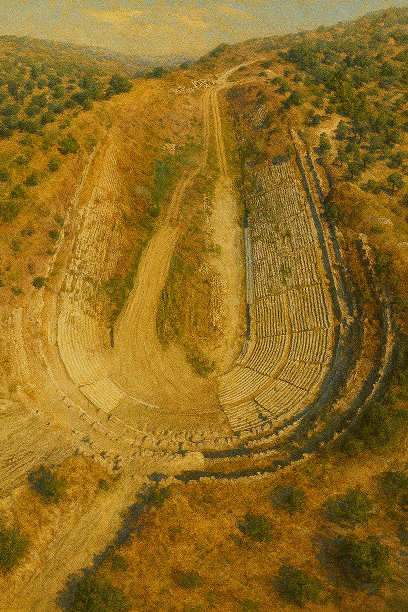 - Theatron: Dini törenler için planlanan ancak heyelan yüzünden tamamlanamayan yapı.