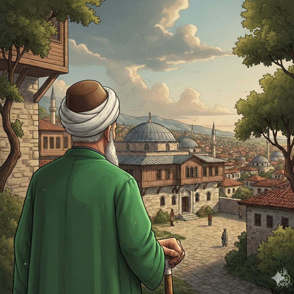 Üftâde Hazretleri’nin Hüdâyî Hazretleri'ne Bursa'da hocalık ettiği tekke temsili (Görsel yapay zekâ ile oluşturulmuştur).