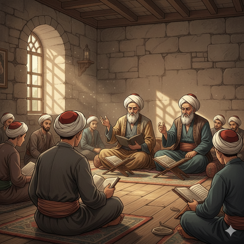Üftâde Hazretleri gençlik döneminde hocalarından ders alırken (Görsel yapay zekâ ile oluşturulmuştur).