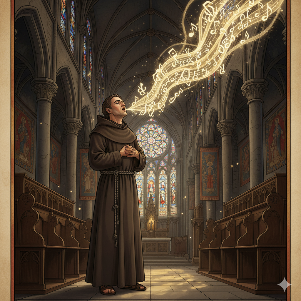 Neumalarla ifade edilen ilahileri okuyan bir rahip tasviri (Görsel yapay zekâ ile oluşturulmuştur).