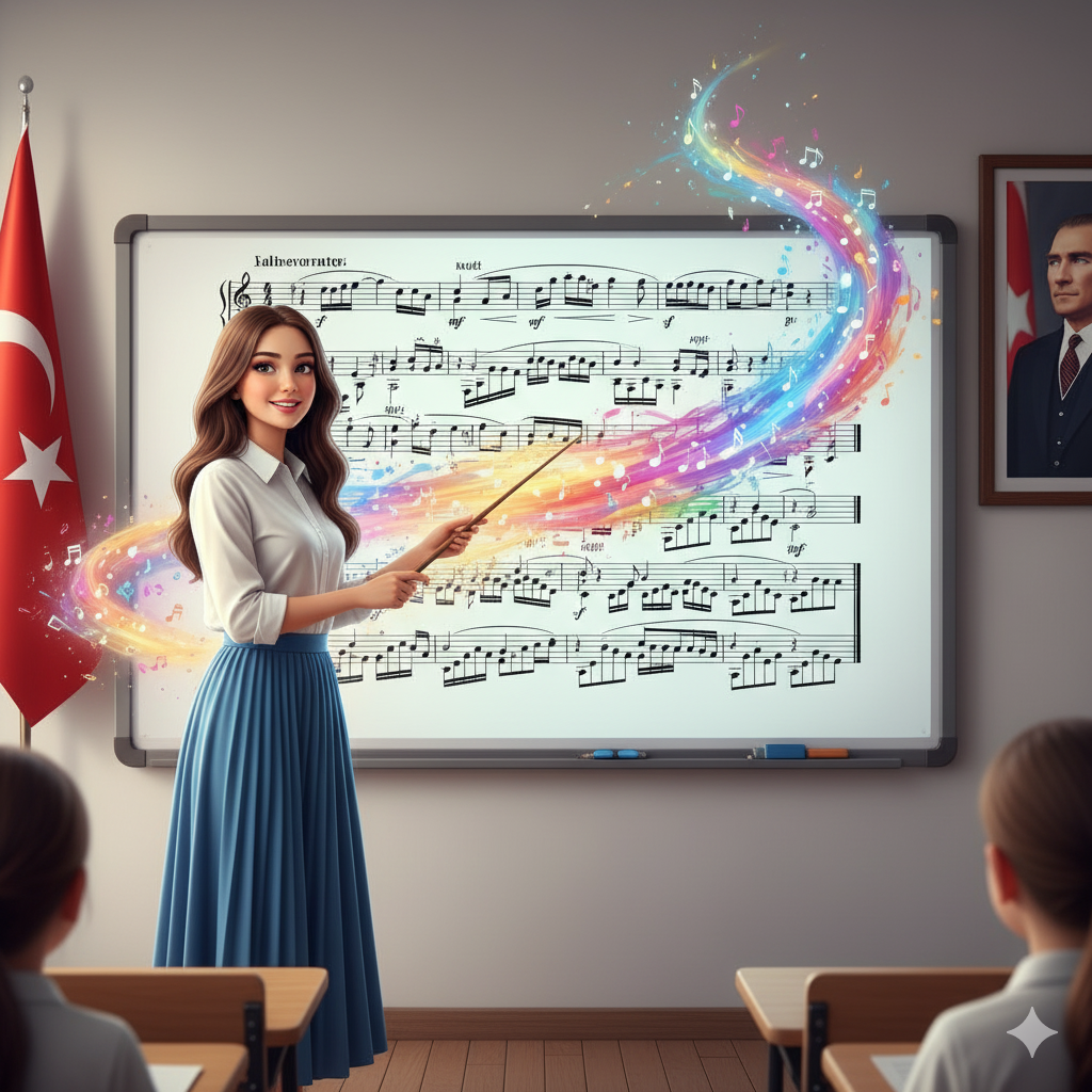 Öğrencilerine nota okumayı öğreten bir öğretmen (Görsel yapay zekâ ile oluşturulmuştur).