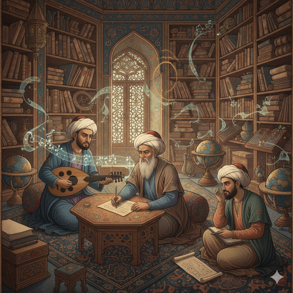 İslam bilim insanları duyduğu sesleri kendi sistemleriyle yazıya geçirirken (Görsel yapay zekâ ile oluşturulmuştur).
