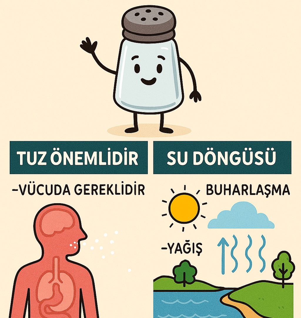 Güneş suyu ısıtır ve buharlaştırır. Buharlaşan su gökyüzüne yükselirken tuz molekülleri (küçük parçacıklar) geride kalır. Zamanla buharlaşma sürekli devam ettiği için tuz miktarı denizlerde birikerek artar. Tatlı sular yenilenirken, tuzlu sular hep aynı kalır. İşte bu yüzden nehirler tatlı, okyanuslar ise tuzludur.