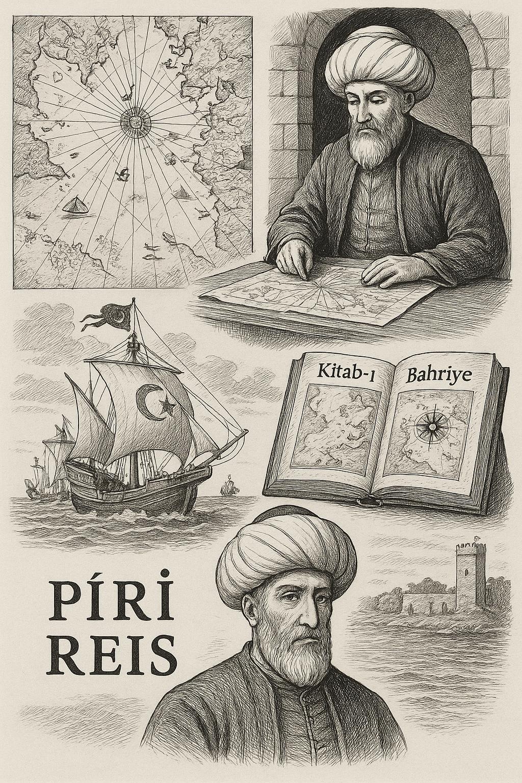Pîrî Reis asıl adıyla Muhiddin Pîrî, 1465 civarında Gelibolu’da doğmuştur. Amcası ünlü denizci Kemal Reis ile birlikte Akdeniz’in birçok yerini dolaşmış, hem savaşlara katılmış hem de denizcilik bilgisini geliştirmiştir. Osmanlı Donanması'nda kaptanlık yapmış, Preveze Deniz Savaşı gibi önemli deniz muharebelerinde bulunmuştur. Denizlerde geçirdiği yıllarda gördüğü kıyıları, limanları ve adaları titizlikle not almış; bu gözlemlerini büyük bir bilgi birikimiyle haritalara ve eserlere dönüştürmüştür. Onun en dikkat çekici başarılarından biri, 1513 yılında çizdiği dünya haritasıdır. Bu haritada Amerika kıtası da yer almakta ve harita günümüzde Topkapı Sarayı’nda sergilenmektedir.