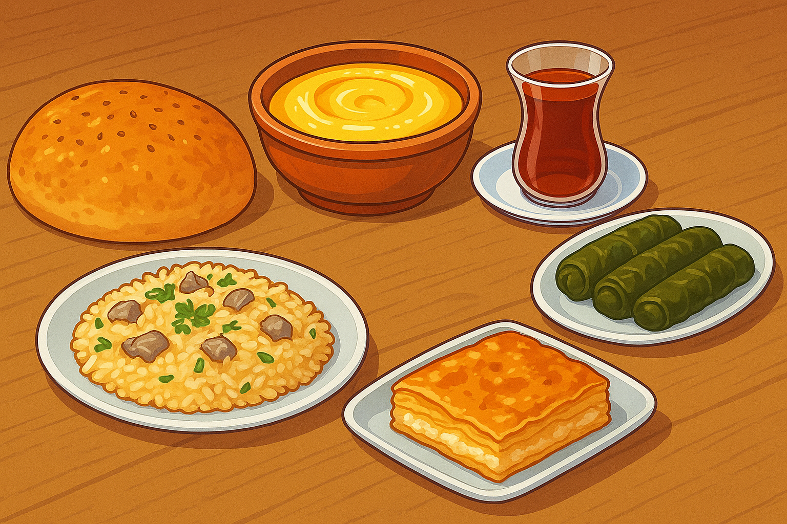 Yöresel Lezzetler: Rize Tava Ekmeği, Muhlama, Çay, Lahana Sarması, Laz Böreği ve Hamsili Pilav (Yapay Zeka Tarafından Oluşturulmuştur.)
