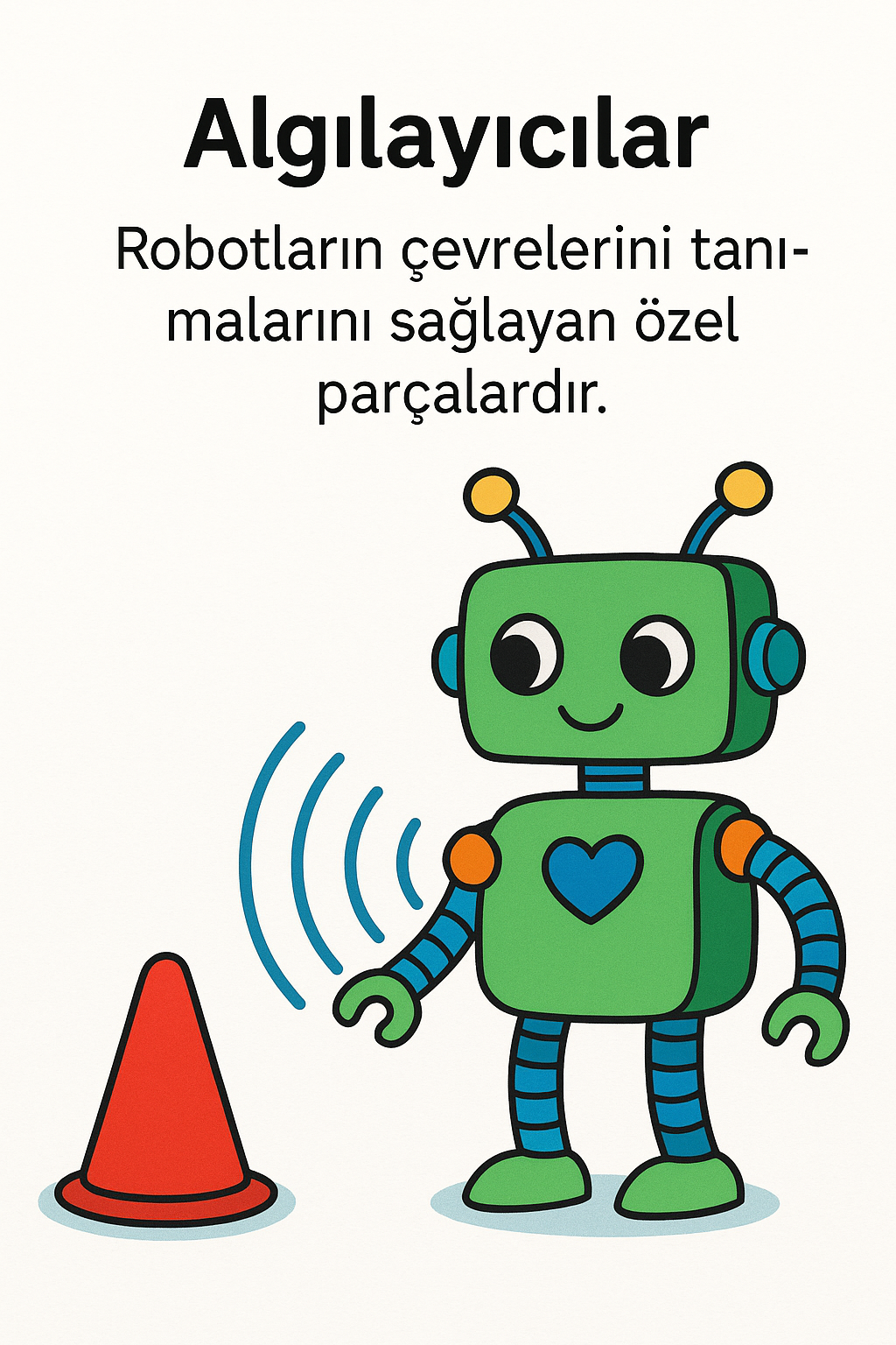 Robotların çevrelerini tanımalarını sağlayan özel parçalardır. Örneğin, bir robotun önündeki engeli fark etmesi için kullanılan sensörler, onun durmasını veya yön değiştirmesini sağlar.