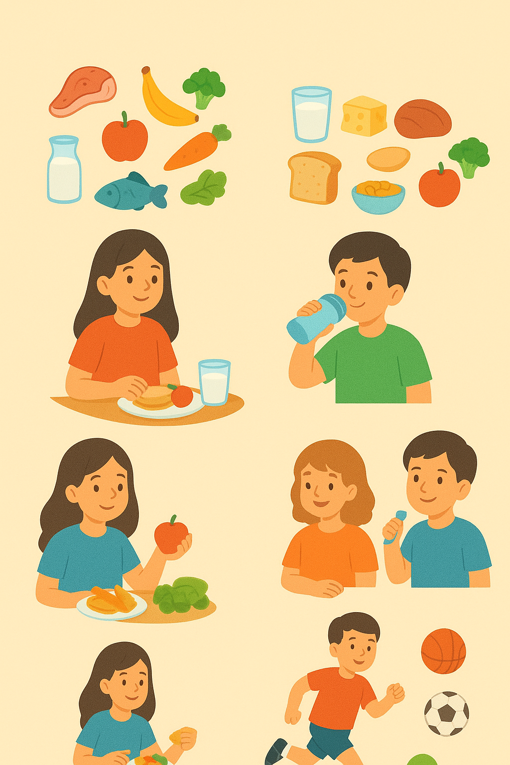 Her gün farklı besin gruplarından yemek gerekir. Süt, yoğurt ve peynir kalsiyum ve protein sağlar. Et, yumurta ve kuru baklagiller protein ve demir içerir. Sebze ve meyveler vitamin, mineral ve posa sağlar. Ekmek ve tahıllar karbonhidrat ve B vitamini verir.