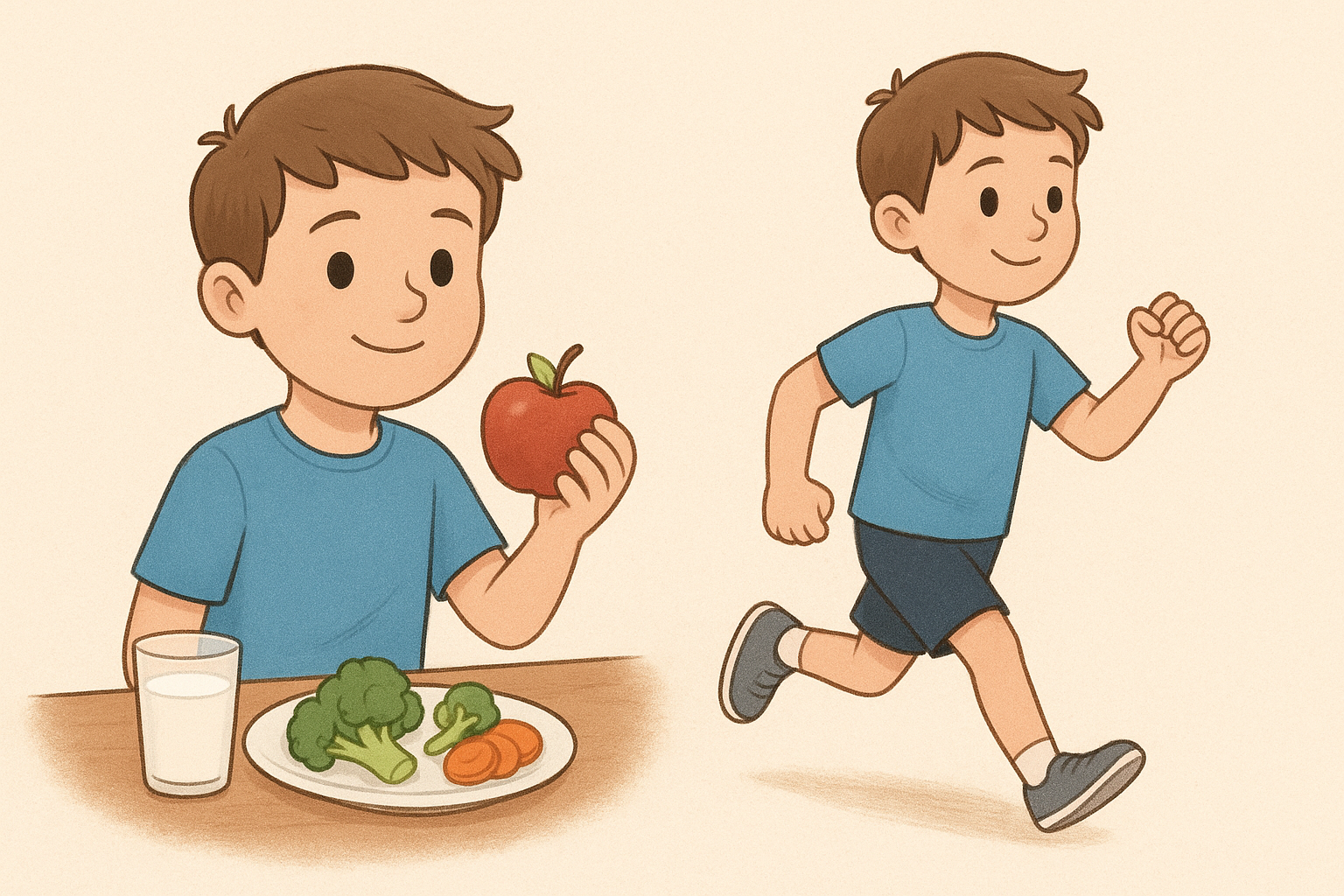 Havuç, elma, armut gibi meyve-sebzeler ve kuruyemiş, süt ve ayran gibi besinler sağlıklı ara öğünlerdir. Oyun ve spor kasları güçlendirir, büyümeye katkı sağlar.
