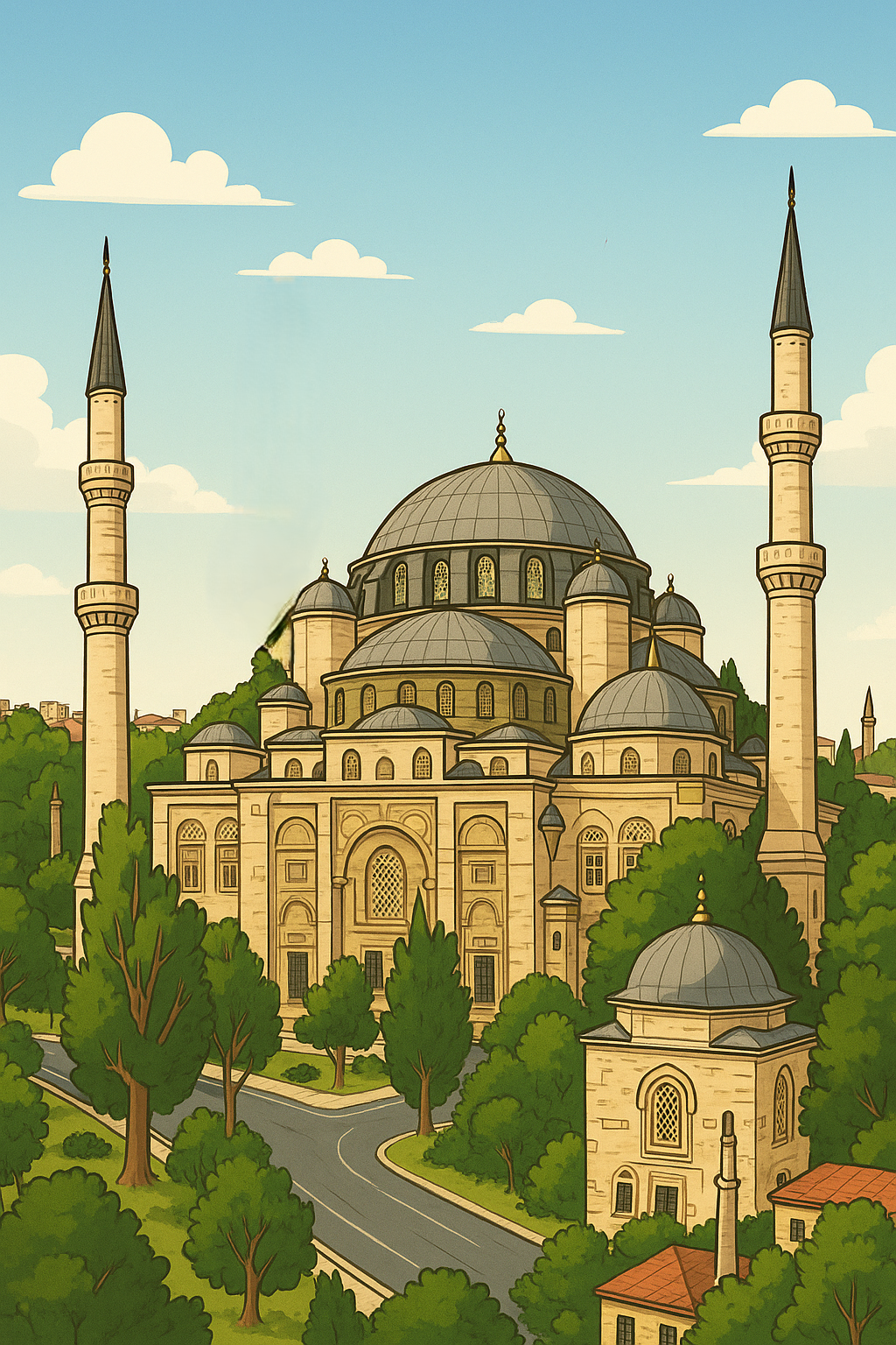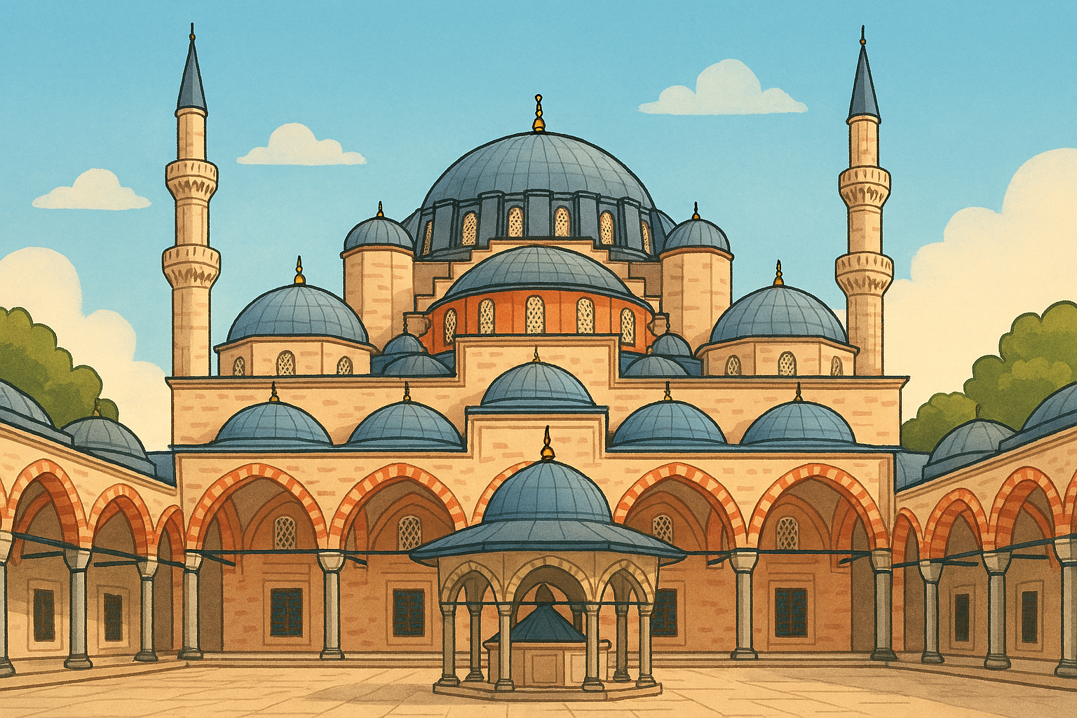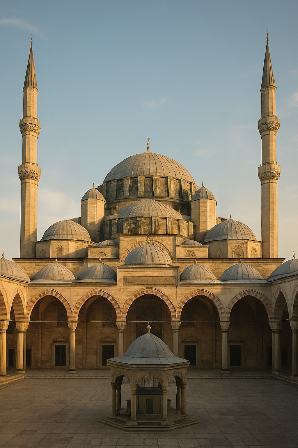 🔍 Kubbenin Altında Minik Bir Gezi Yap: Avluya gir ve caminin büyük kubbesine doğru yürürken başını yukarı kaldır. Bu dev yapı nasıl dengede duruyor diye düşün. Mimar Sinan’ın zekâsını keşfet!