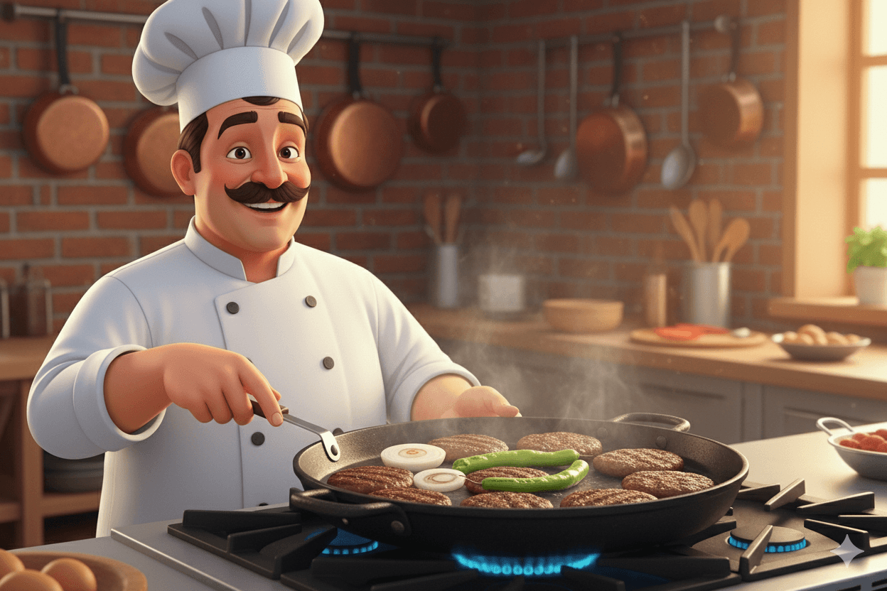 The köftes are cooked on a grill over smoldering hardwood fire. Hands are lightly moistened during shaping; excessive water must be avoided as it may cause the köfte to fall apart.
