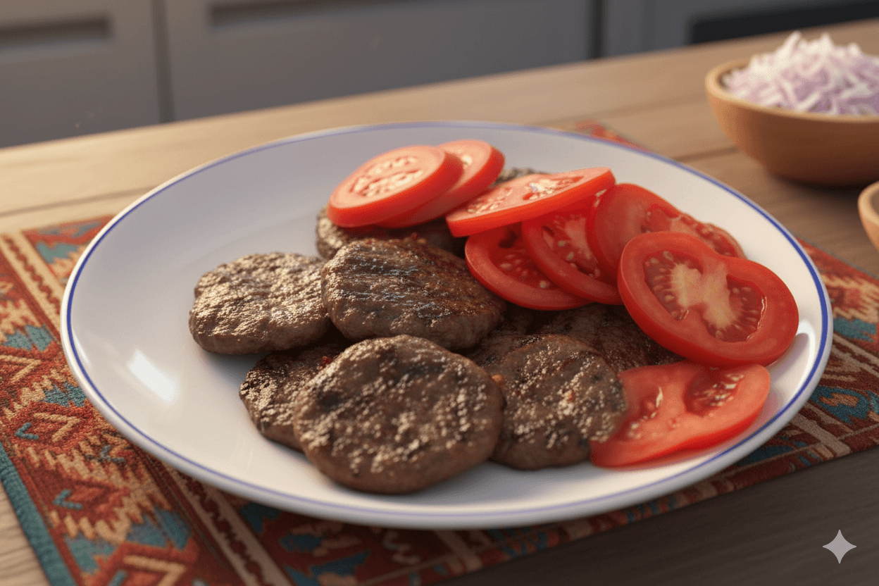 One serving consists of seven pieces, with a total weight of no less than 175 grams. Köfte is typically served on pide, accompanied by grilled tomatoes and pointed peppers, as well as fresh herbs and salad.