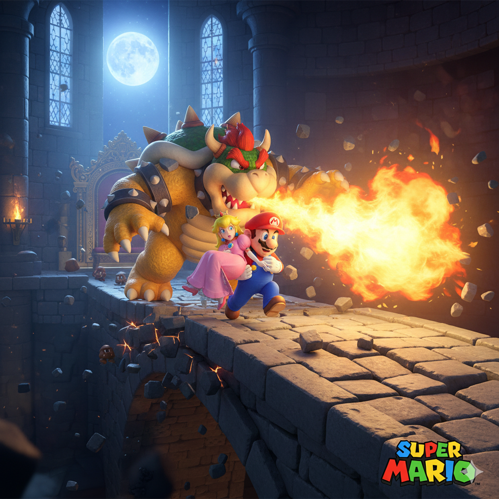 Süper Mario, Prenses Peach'i kurtarırken (Görsel yapay zekâ ile oluşturulmuştur).