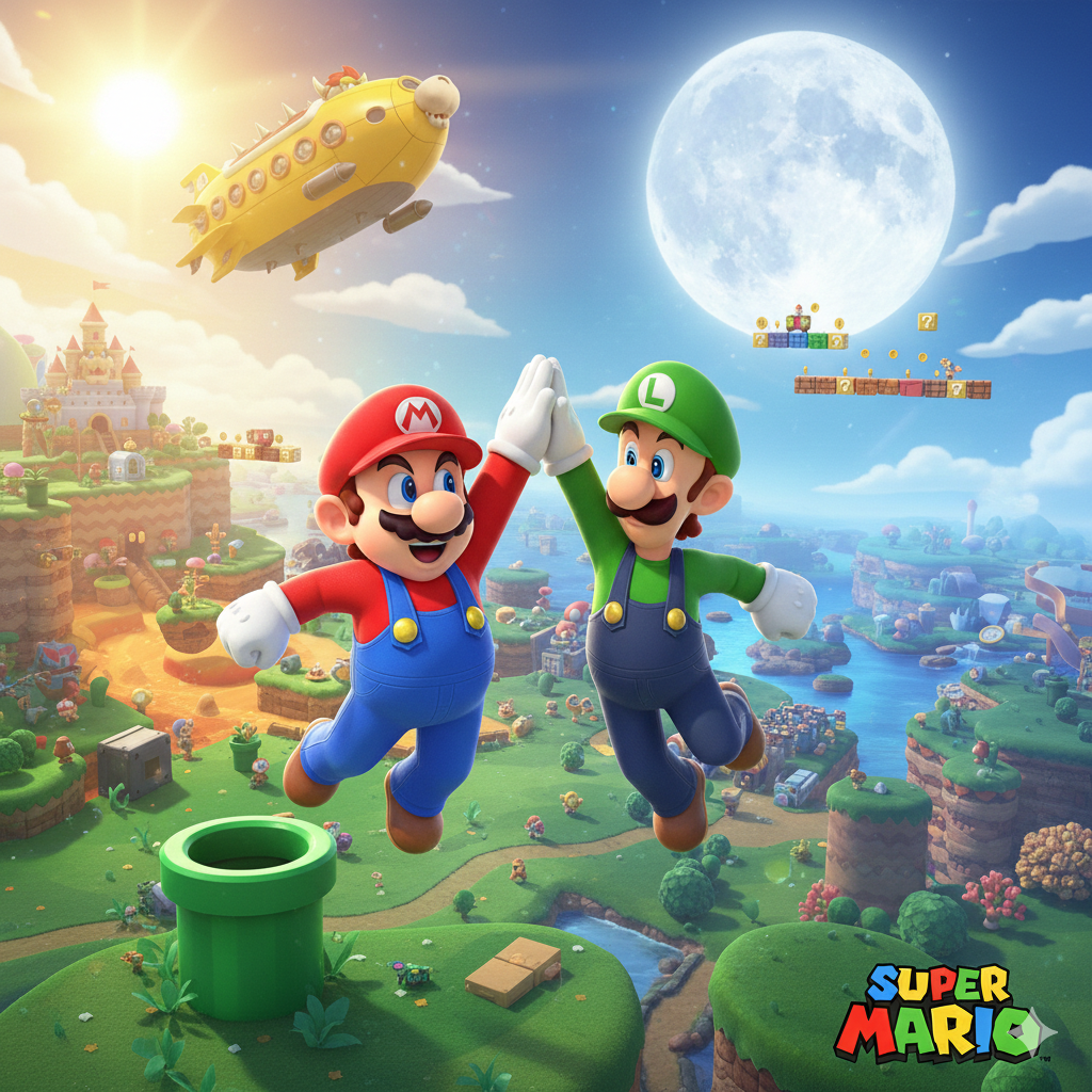 Güncel görünümüyle Süper Mario Video Oyunu (Görsel yapay zekâ ile oluşturulmuştur).