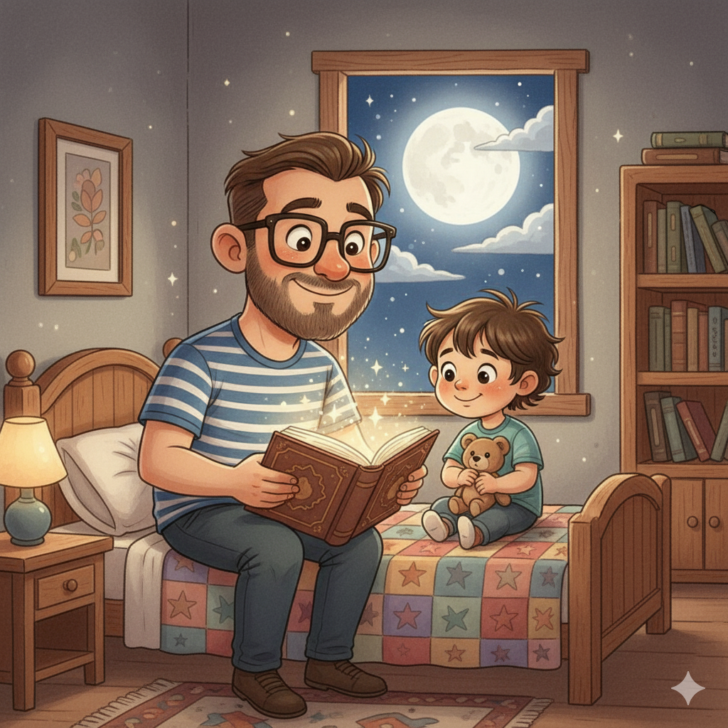 Yatmadan önce çocuğuna masal okuyan bir baba (Görsel yapay zekâ ile oluşturulmuştur).